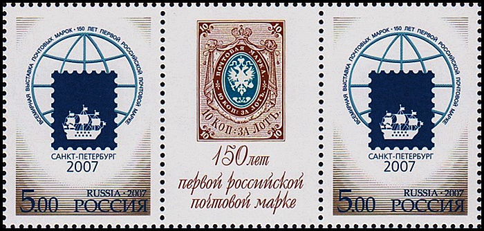 Внутри синего овала помещался герб Российской империи белого цвета. Мелкие надписи, опоясывающие овал сообщали, что почтовая марка имеет ценность 10 копеек за лот (лот – это старинная русская мера веса равная примерно 12,8 грамма). Такая же надпись только более крупными буквами была у нижнего края марки.