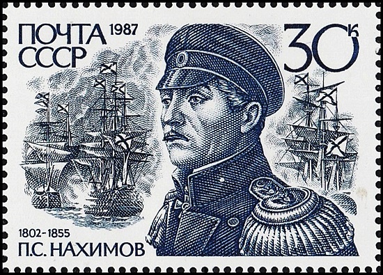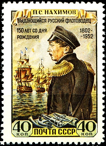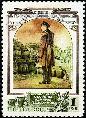 Справа, на полях блока дан портрет адмирала П.С. Нахимова, командовавшего эскадрой, которая разгромила турецкий флот в Синопском сражении, ниже приведены слова императора Николая I. «Истреблением турецкой эскадры при Синопе вы украсили летопись русского флота новою победою, которая навсегда останется памятною в морской истории».