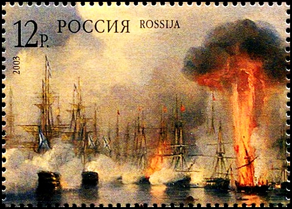 На марке, с переходом на поля блока, воспроизведена картина А.П. Боголюбова «Синопский бой. 18 ноября 1853 года», написанная художником в 1856-1860 гг. и ныне находящаяся в Центральном военно-морском музее Санкт-Петербурга.