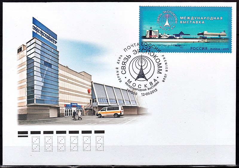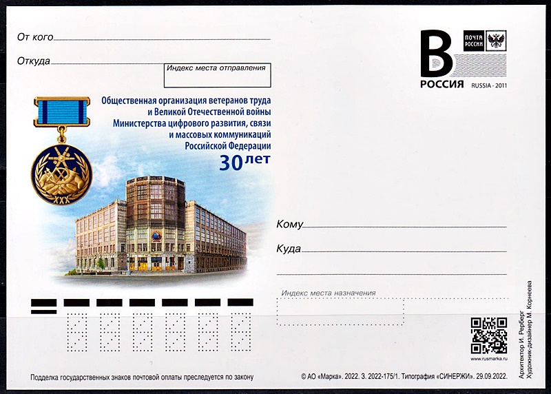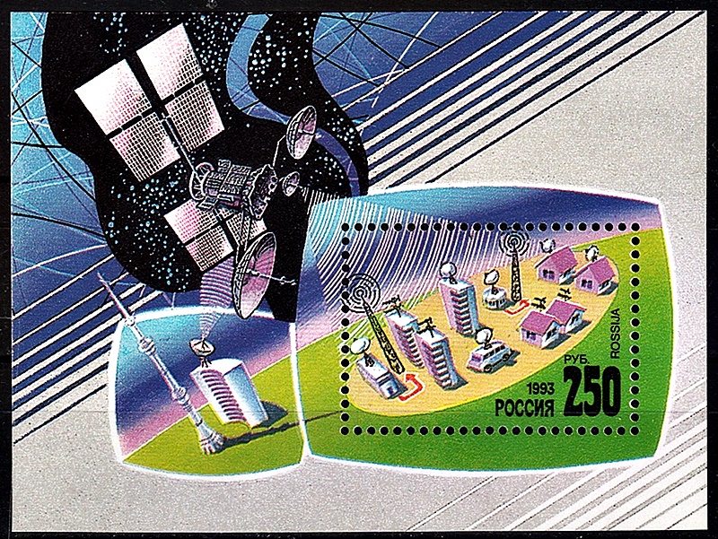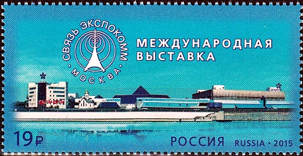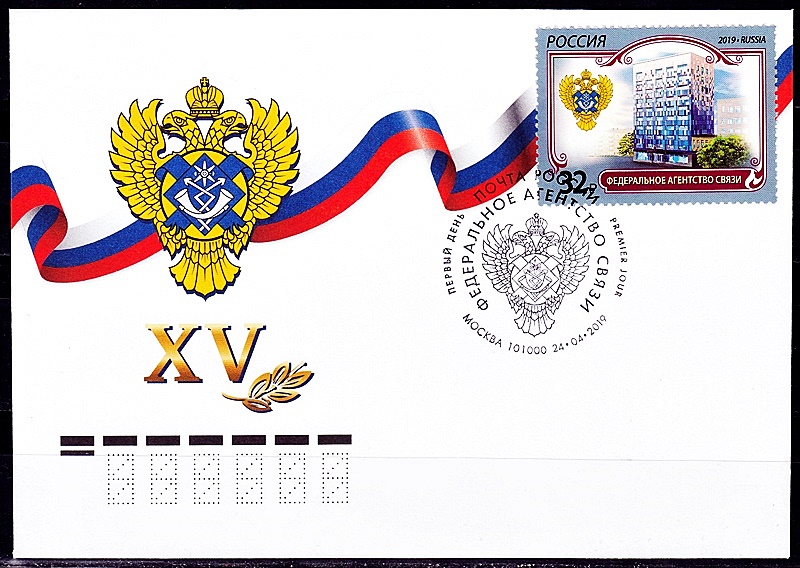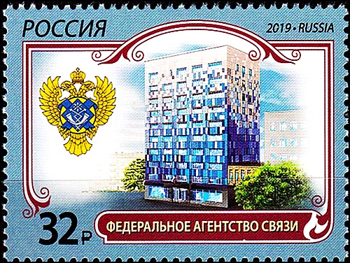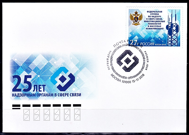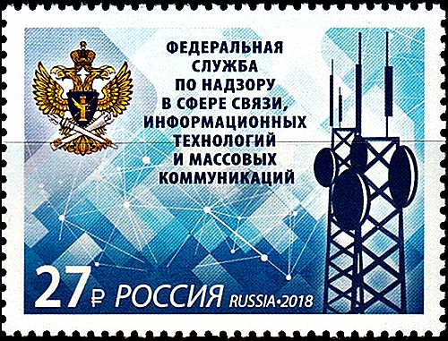 На почтовой марке изображена эмблема на фоне элементов фирменного стиля Федеральной службы по надзору в сфере связи, информационных технологий и массовых коммуникаций.