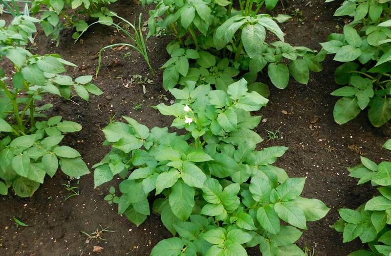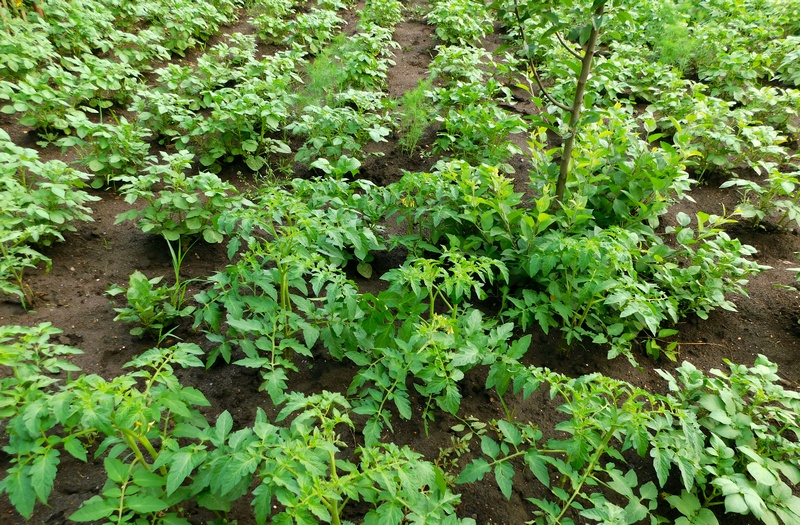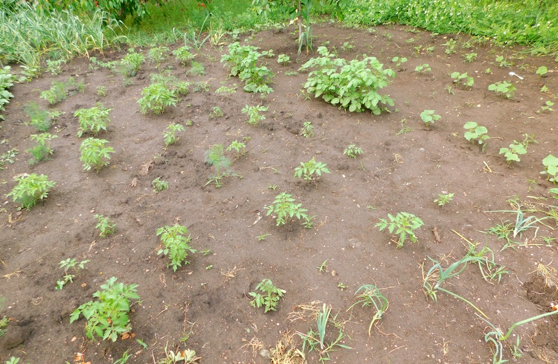 | Помидоры(на переднем плане, - далее картофель) из рассады, уже цветут, нижние листочки/веточки сегодня оборвал,- пикировал.